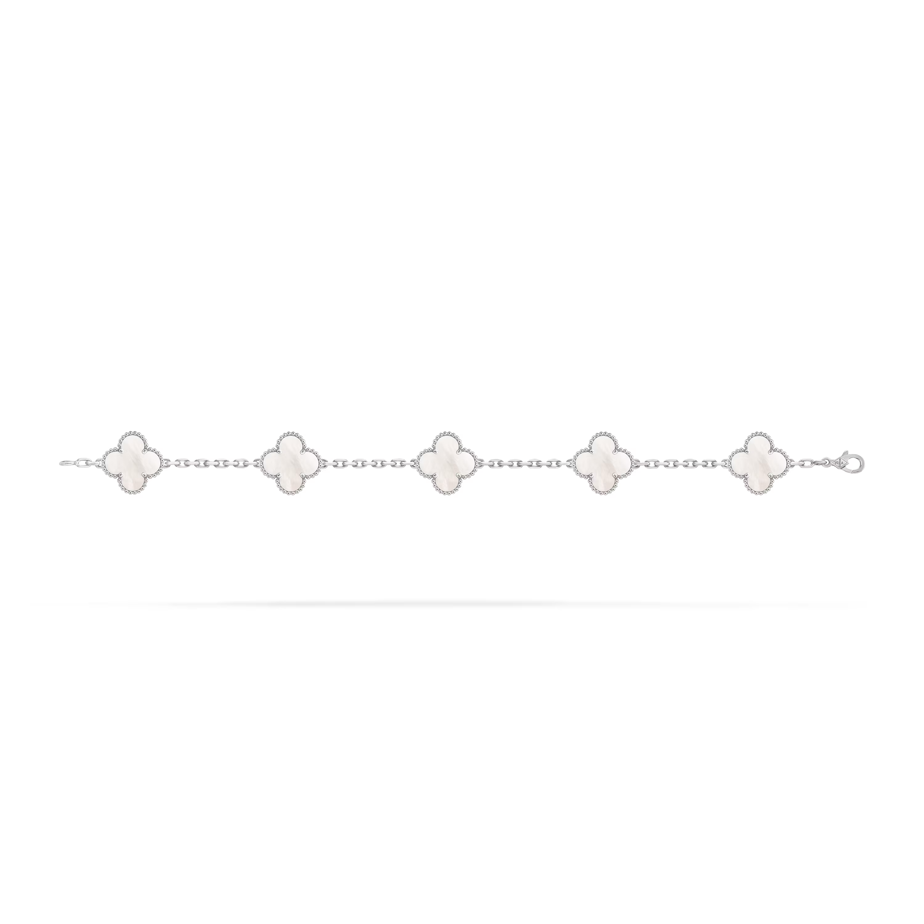 This bracelet features five Vintage Alhambra motifs, evenly spaced along the chain. The symmetrical composition creates a balanced and elegant rhythm on the wrist, highlighting the purity of the original design.