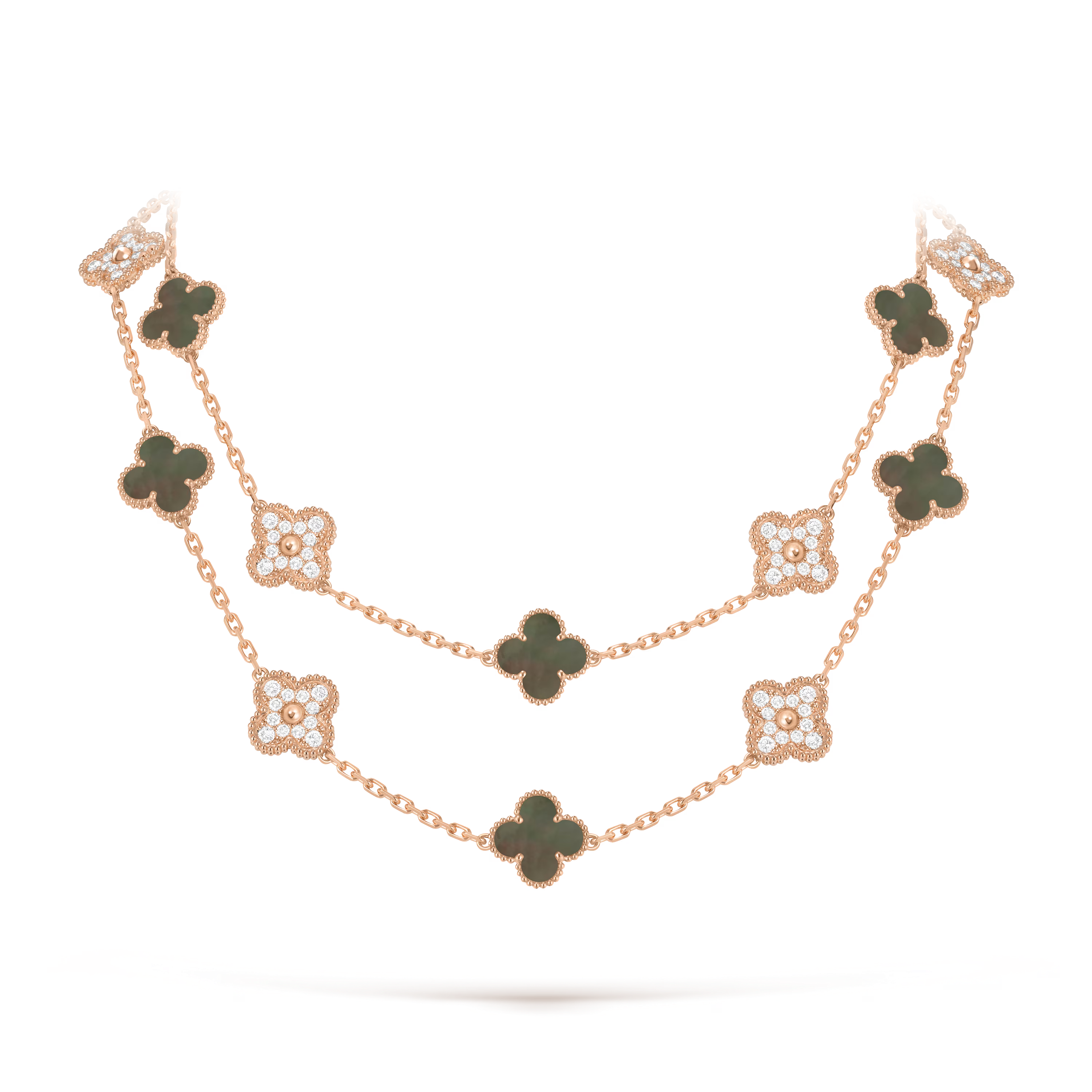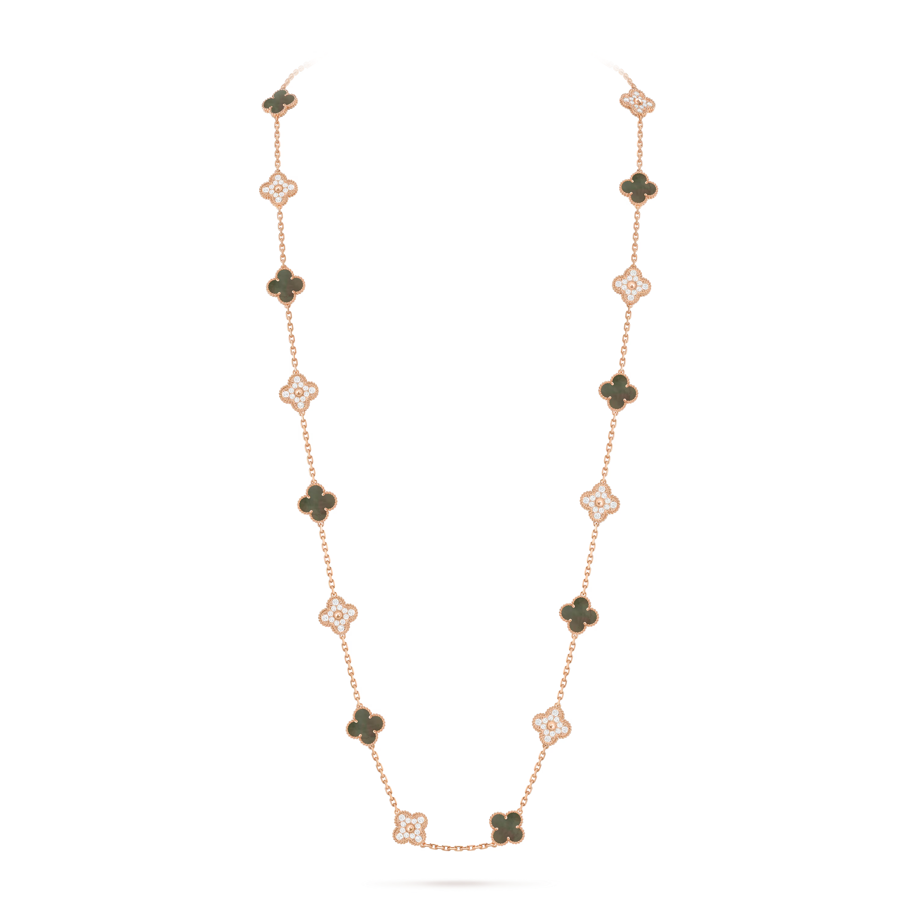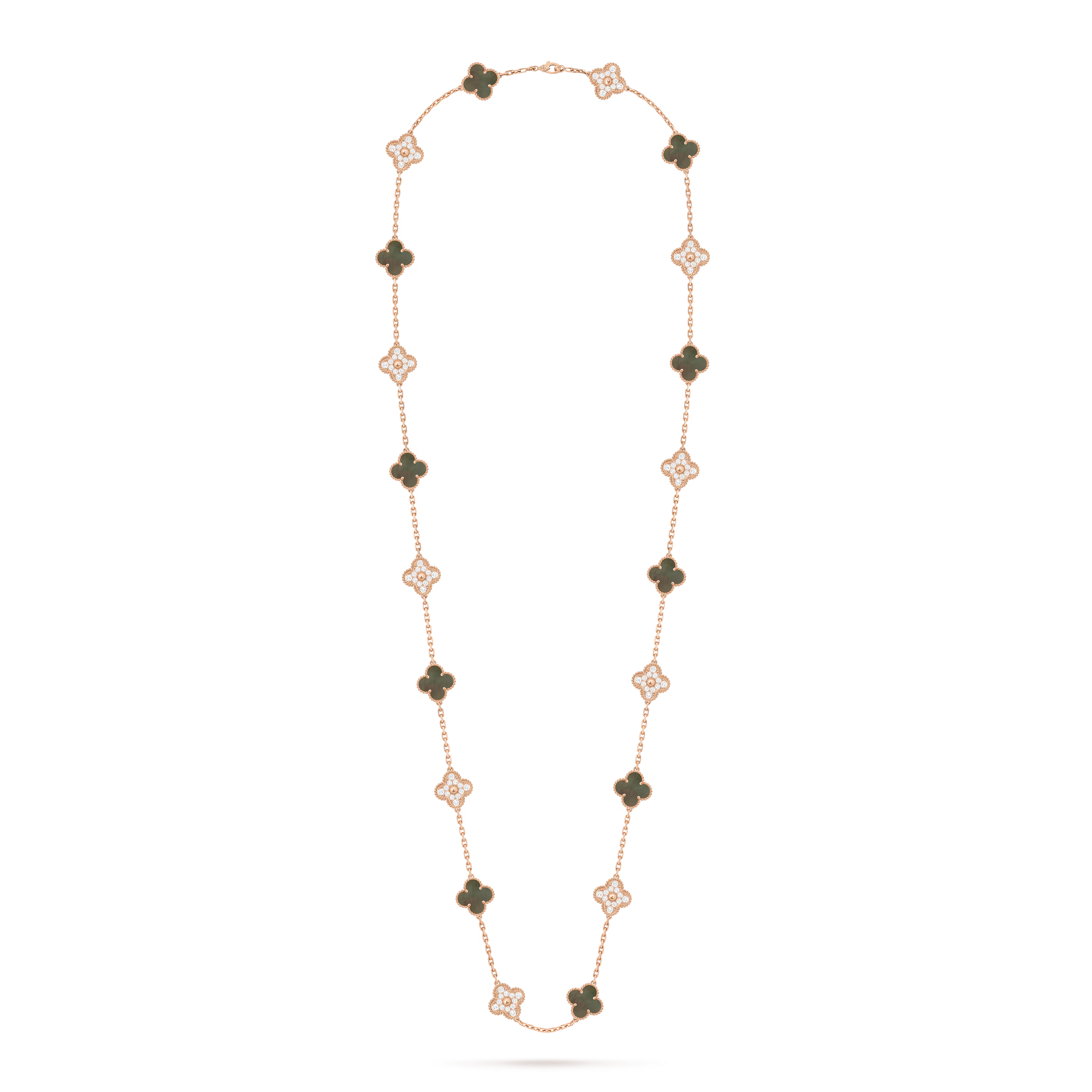 Inspired by the universal symbol of good fortune, the Vintage Alhambra collection was introduced in 1968. This long necklace reimagines the emblem through repeated motifs, creating a graceful rhythm and instantly recognizable style.