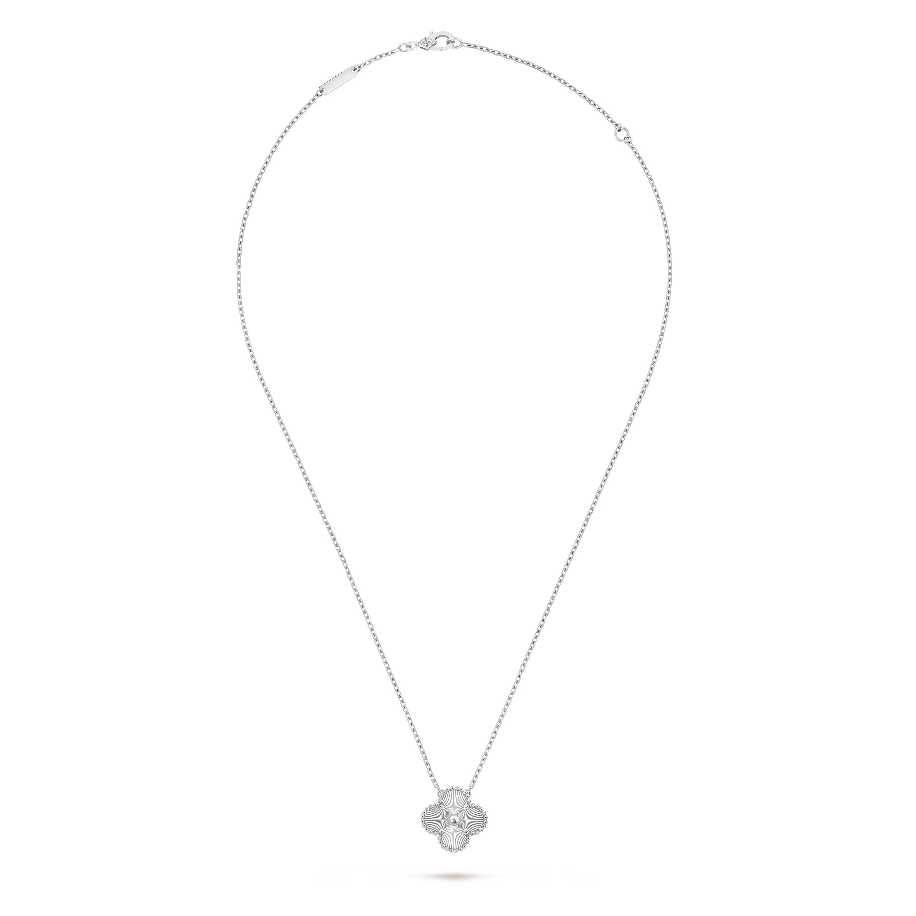 Crafted entirely in luminous 18K white gold, the motif reveals a cool, silvery sheen that enhances its refined silhouette. The signature beaded contour—delicately shaped and polished by hand—adds subtle dimension, catching the light with every movement. Its understated brilliance makes this pendant a versatile treasure, equally suited for daily wear or sophisticated occasions.