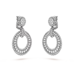 Each earring is crafted in 18K white gold and adorned with carefully selected brilliant-cut diamonds, set to enhance their radiance and brilliance. The lace-inspired design allows light to pass through, creating a subtle shimmer that dances with every movement, reflecting Van Cleef & Arpels’ exceptional attention to detail and artisanal mastery.