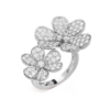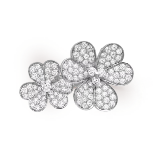 Crafted in 18K white gold, the ring features a beautifully sculpted Frivole flower motif, delicately set with brilliant diamonds at the heart of each petal. The contrast between the soft, polished gold and the sparkling diamonds creates a harmonious balance of light and texture. The between-the-finger design makes this ring a bold statement, yet its refined proportions ensure it remains elegant and wearable.