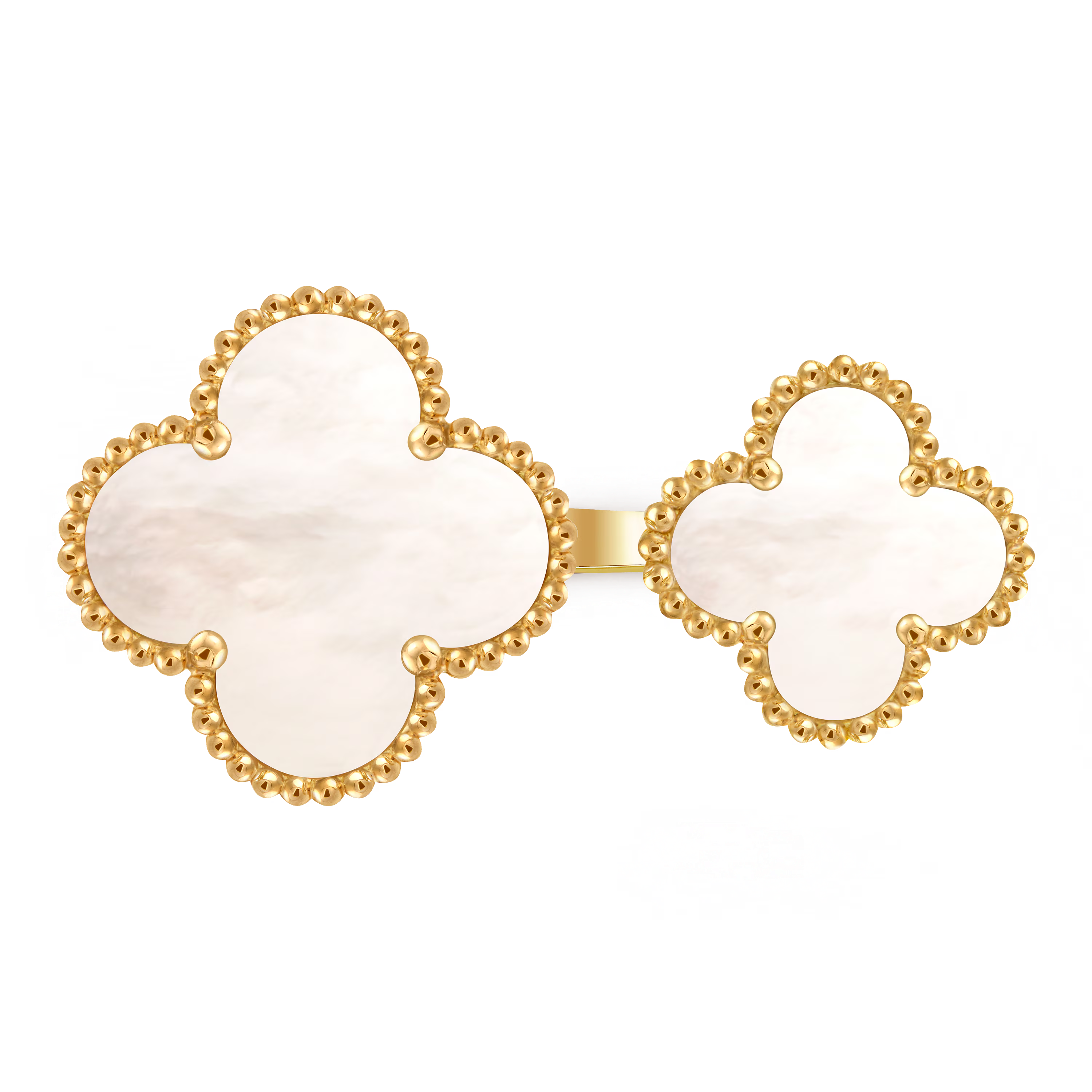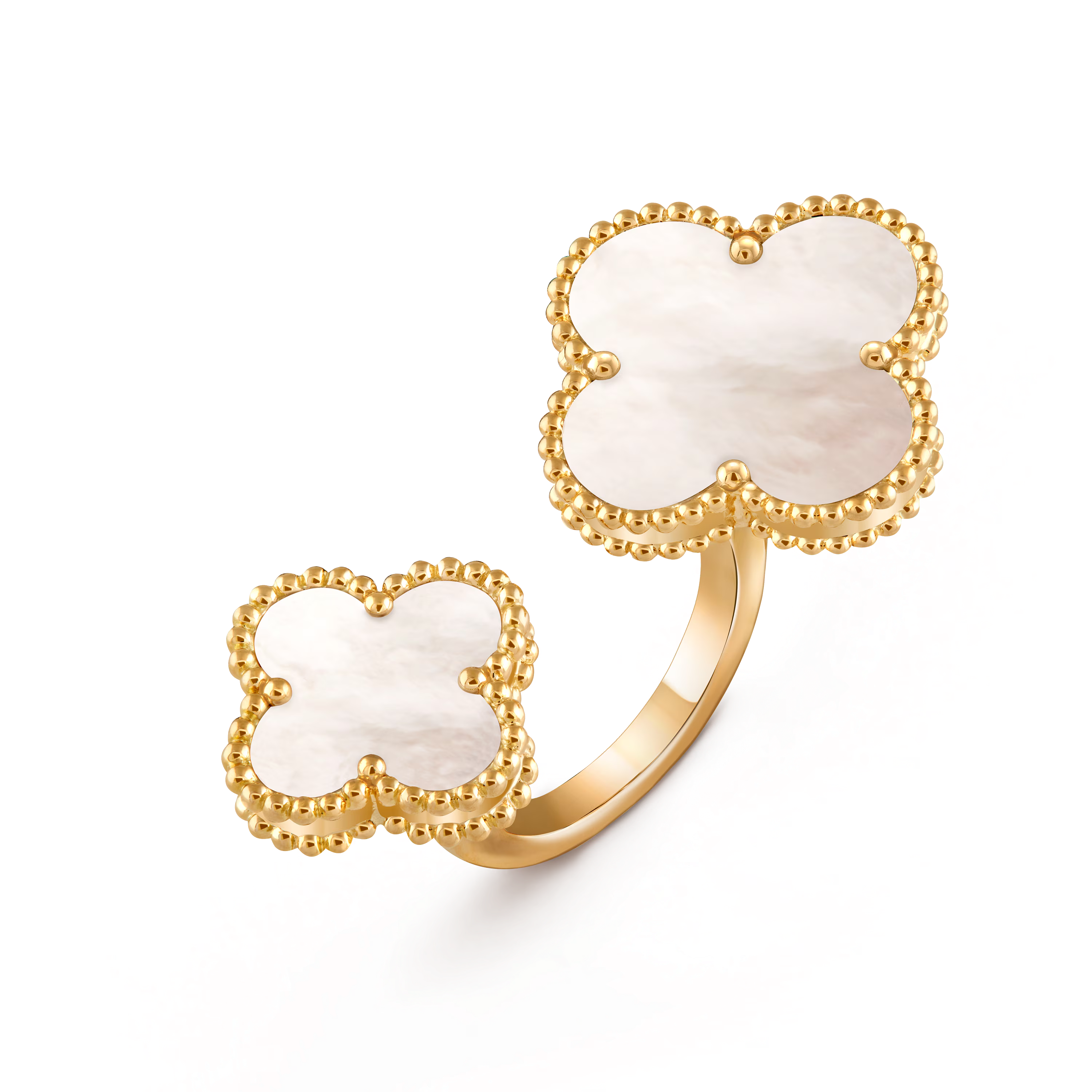 Crafted in 18K yellow gold, the ring features the signature Alhambra motif with its signature hand-polished contours and radiant finish. Set with luminous mother-of-pearl or other precious stones, this ring offers a captivating combination of elegance and creativity. The sculptural design creates a striking visual effect, making it a true statement piece for the bold, sophisticated wearer.