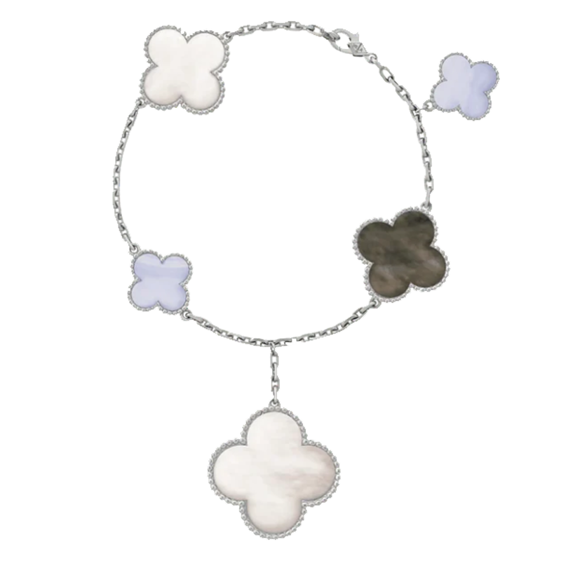 The Magic Alhambra bracelet reinterprets the Maison’s iconic four-leaf motif through a harmonious play of contrasting sizes. With five motifs arranged in an elegant asymmetric sequence, the piece expresses freedom, movement, and refined imagination.