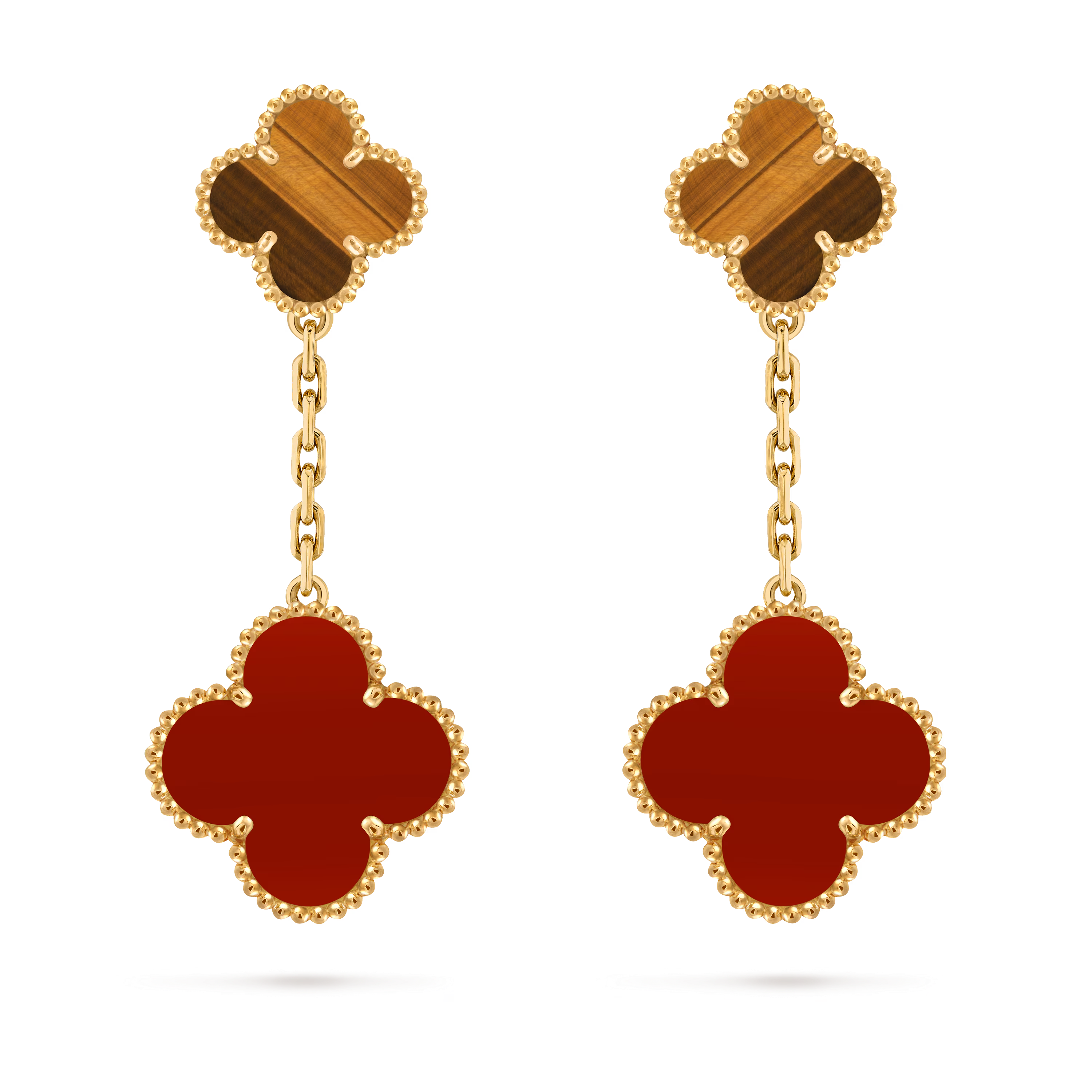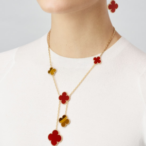 Crafted in luminous 18K gold, each motif is adorned with natural stones carefully chosen for their purity, depth, and radiance — such as iridescent mother-of-pearl, deep onyx, or warm carnelian, depending on the variation. The signature beaded gold contour, meticulously polished by hand, frames each motif like a delicate halo, reflecting Van Cleef & Arpels’ unmatched savoir-faire.