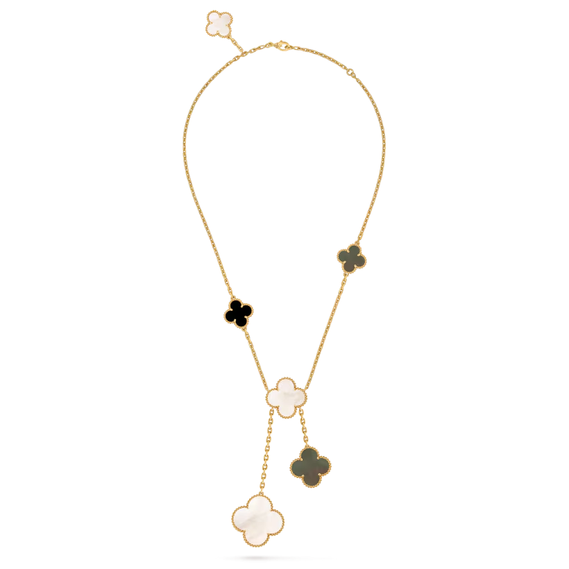 The Magic Alhambra necklace features six signature four-leaf clover motifs crafted from natural materials and framed with delicate 18K gold beaded edges. The design symbolizes luck, elegance, and timeless craftsmanship.