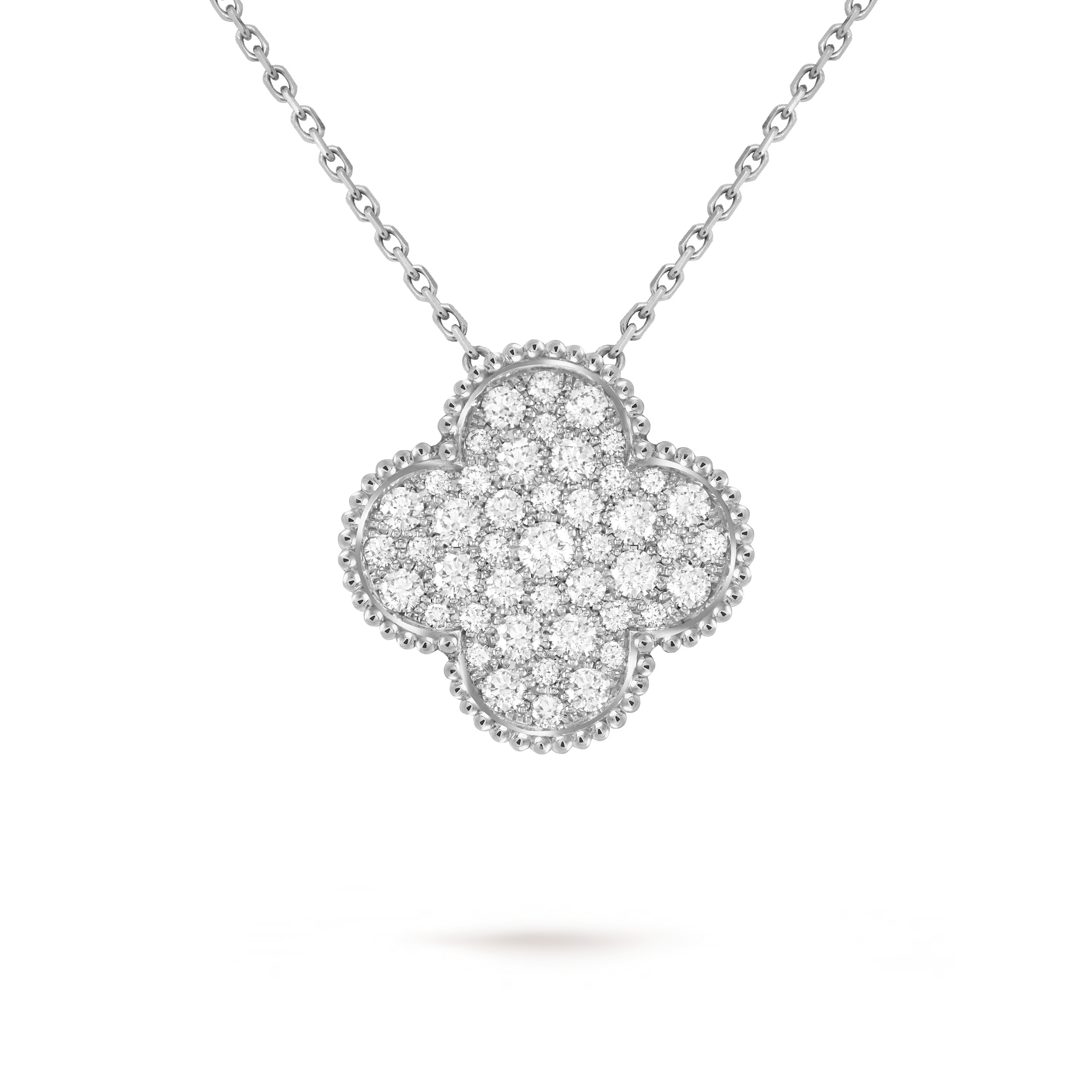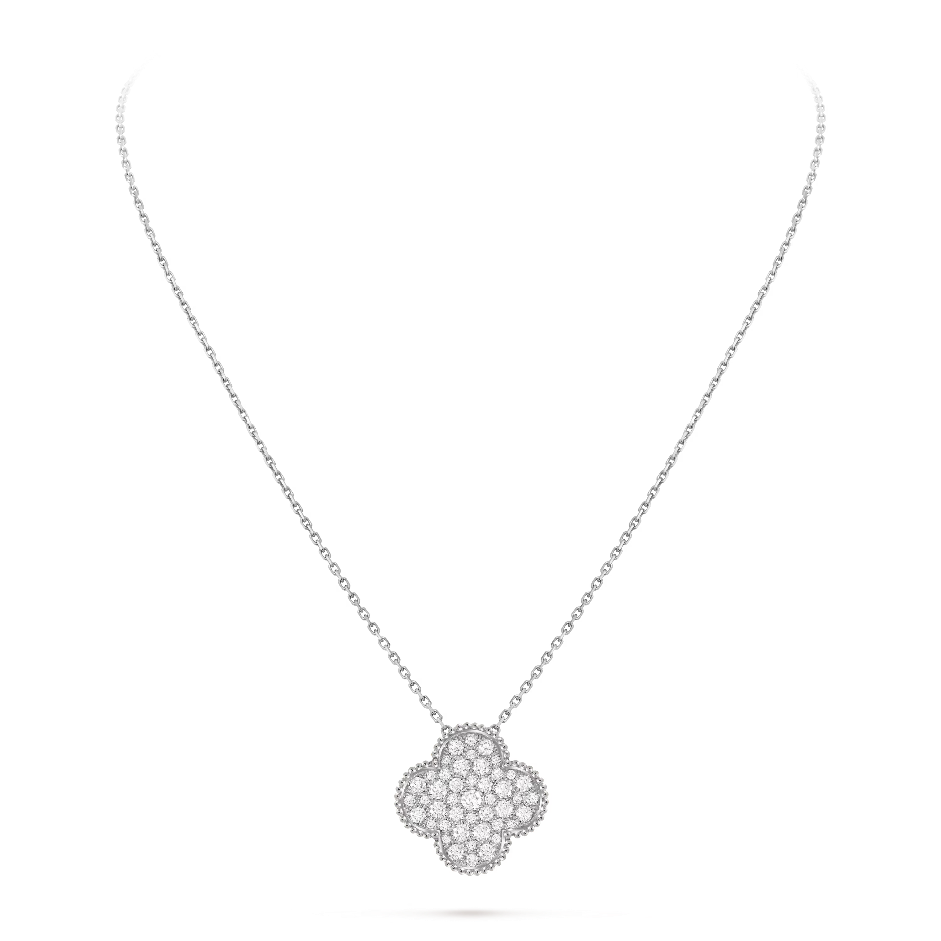 Encircling the motif is the Maison’s signature beaded edge, adding texture and dimension to the design. This timeless detail highlights the pendant’s sculptural silhouette while reinforcing the unmistakable identity of the Alhambra collection.