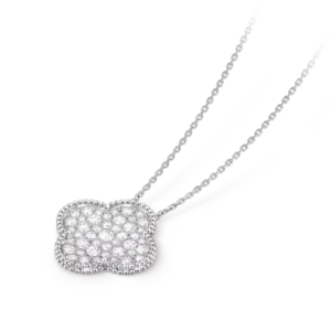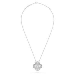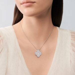 Crafted in the distinctive Magic Alhambra proportions, the pendant features a larger, expressive motif that showcases the diamonds with exceptional clarity and presence. Its soft curves and harmonious symmetry reflect the Maison’s poetic interpretation of nature-inspired symbols.