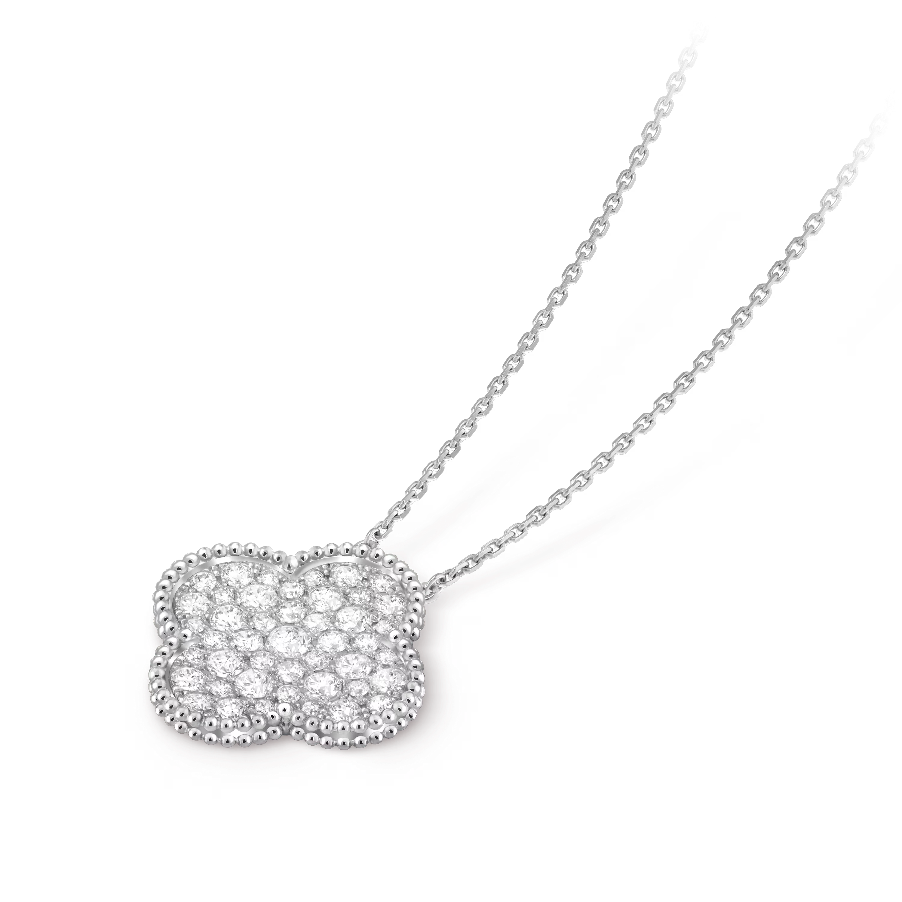Every surface of the motif is meticulously set with diamonds, creating a continuous field of light. The stones are arranged with precision to ensure exceptional sparkle, enhancing the pendant’s refined depth and luxurious allure from every angle.