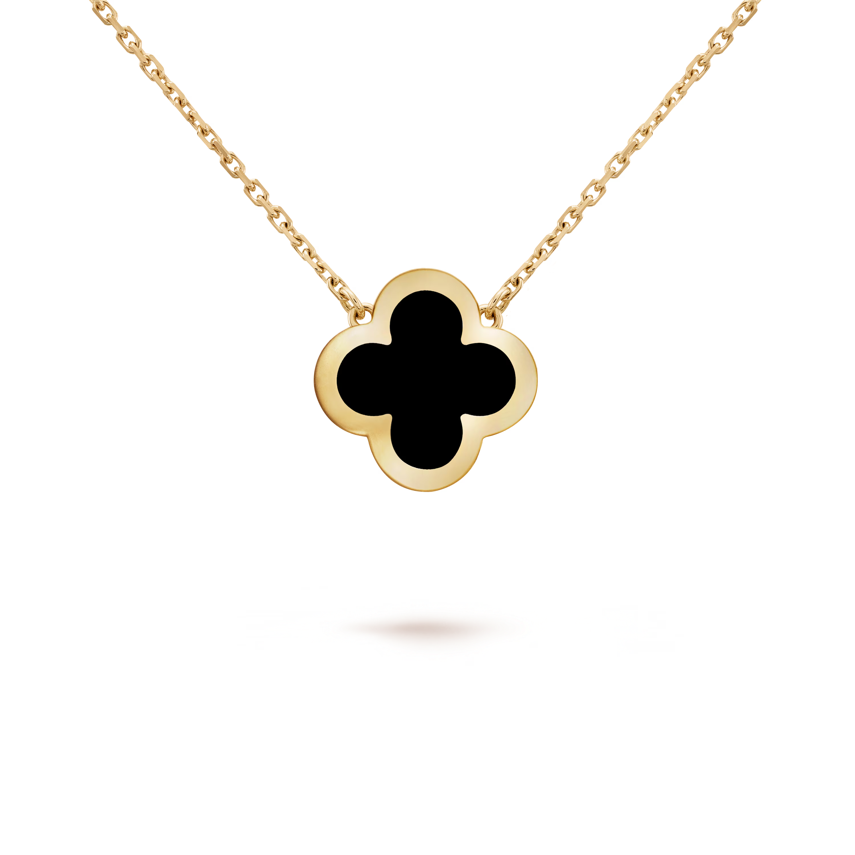 The natural onyx reveals a rich, velvety black surface—smooth, bold, and beautifully uniform. Its intense color creates a captivating contrast against the warm glow of yellow gold, highlighting the Pure Alhambra collection’s minimalist lines and graceful symmetry. The result is a motif that feels both contemporary and unmistakably iconic.