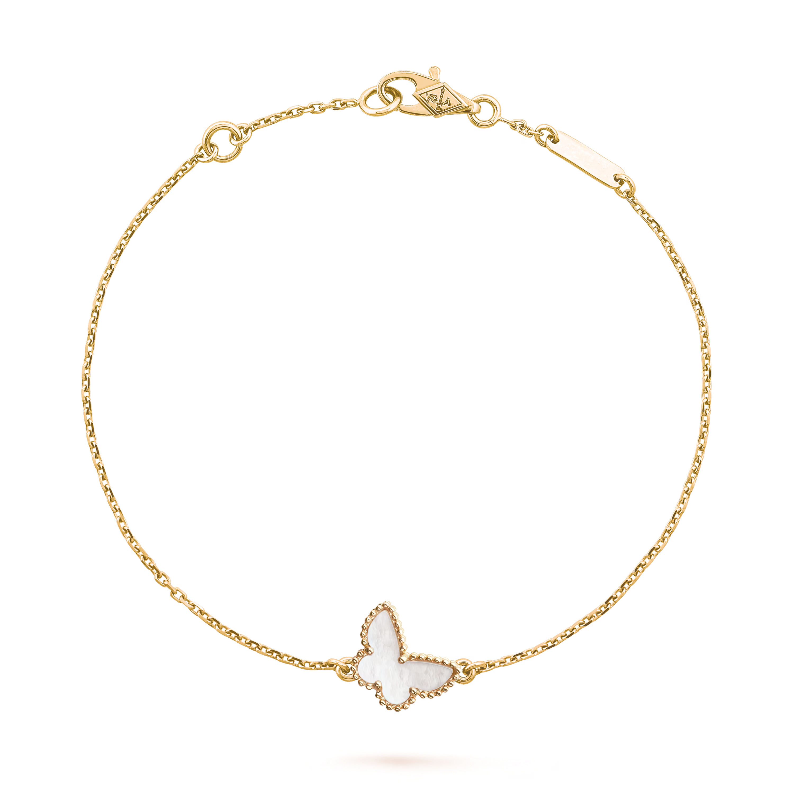 At the heart of the design is a delicately crafted butterfly motif, rendered in the Sweet Alhambra scale. Graceful and refined, the butterfly evokes freedom and renewal, adding a whimsical and elegant accent to the bracelet.
