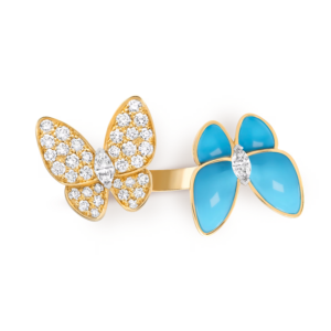 A radiant celebration of grace and movement, the Two Butterfly Between the Finger Ring brings the timeless charm of Van Cleef & Arpels’ butterfly motif to life with vibrant color and luminous sparkle. Crafted in glowing 18K yellow gold, the design reveals two butterflies seemingly suspended in mid-air—an enchanting expression of freedom and lightness.
