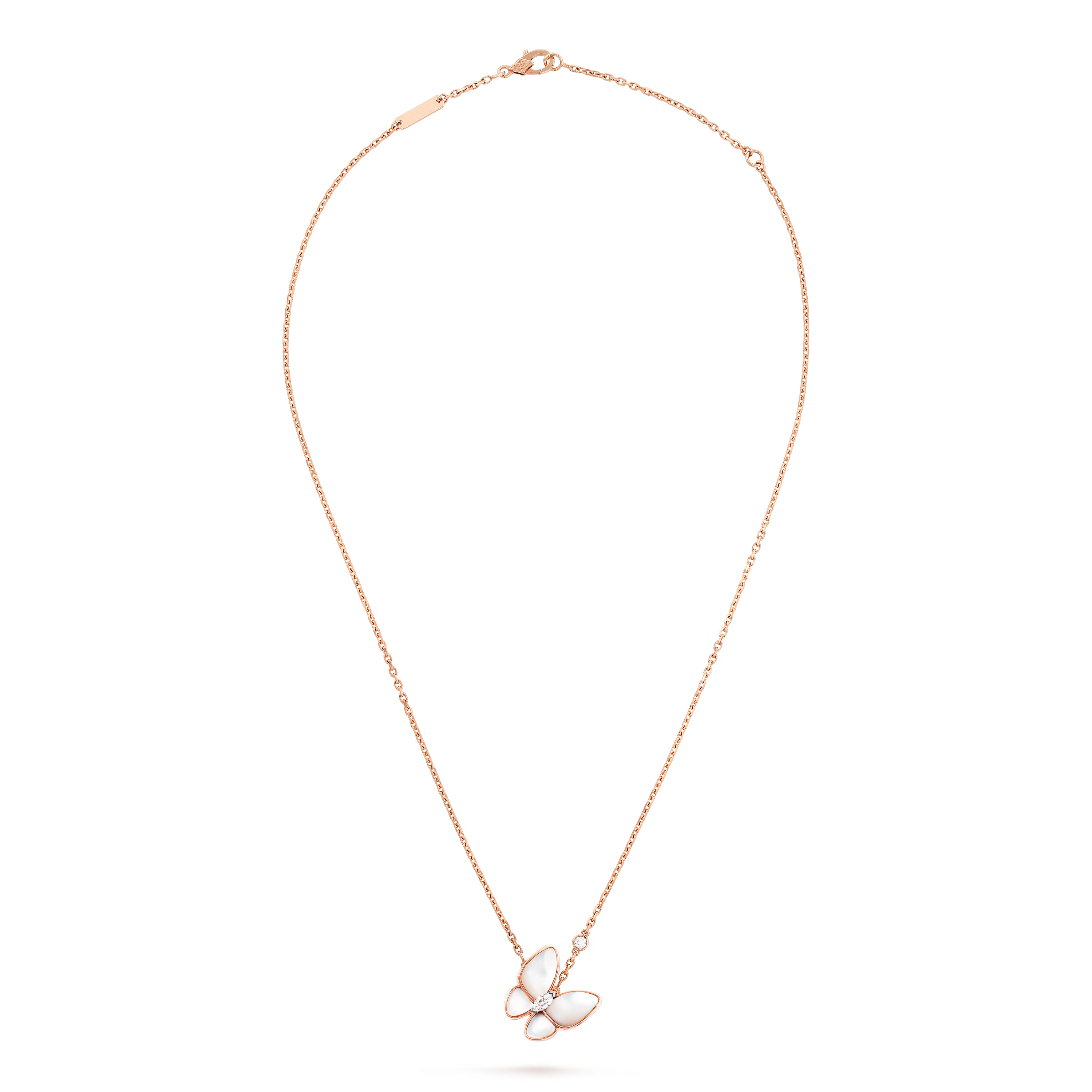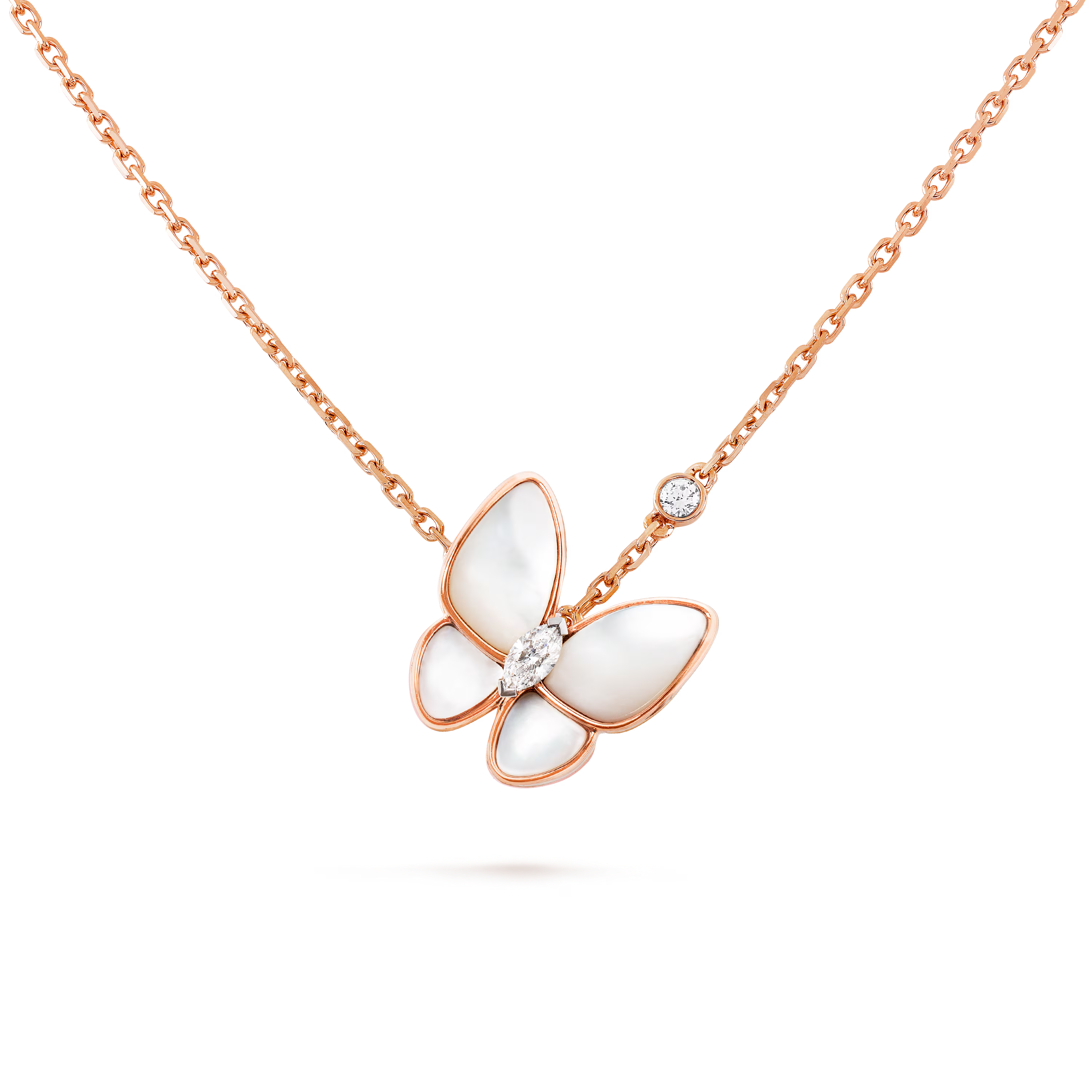 Delicate, poetic, and full of luminous charm, the Two Butterfly Pendant showcases Van Cleef & Arpels’ enchanting vision of nature. Crafted in warm 18K rose gold, this graceful creation pairs shimmering mother-of-pearl with brilliant diamonds to evoke the tender dance of two butterflies in flight.
