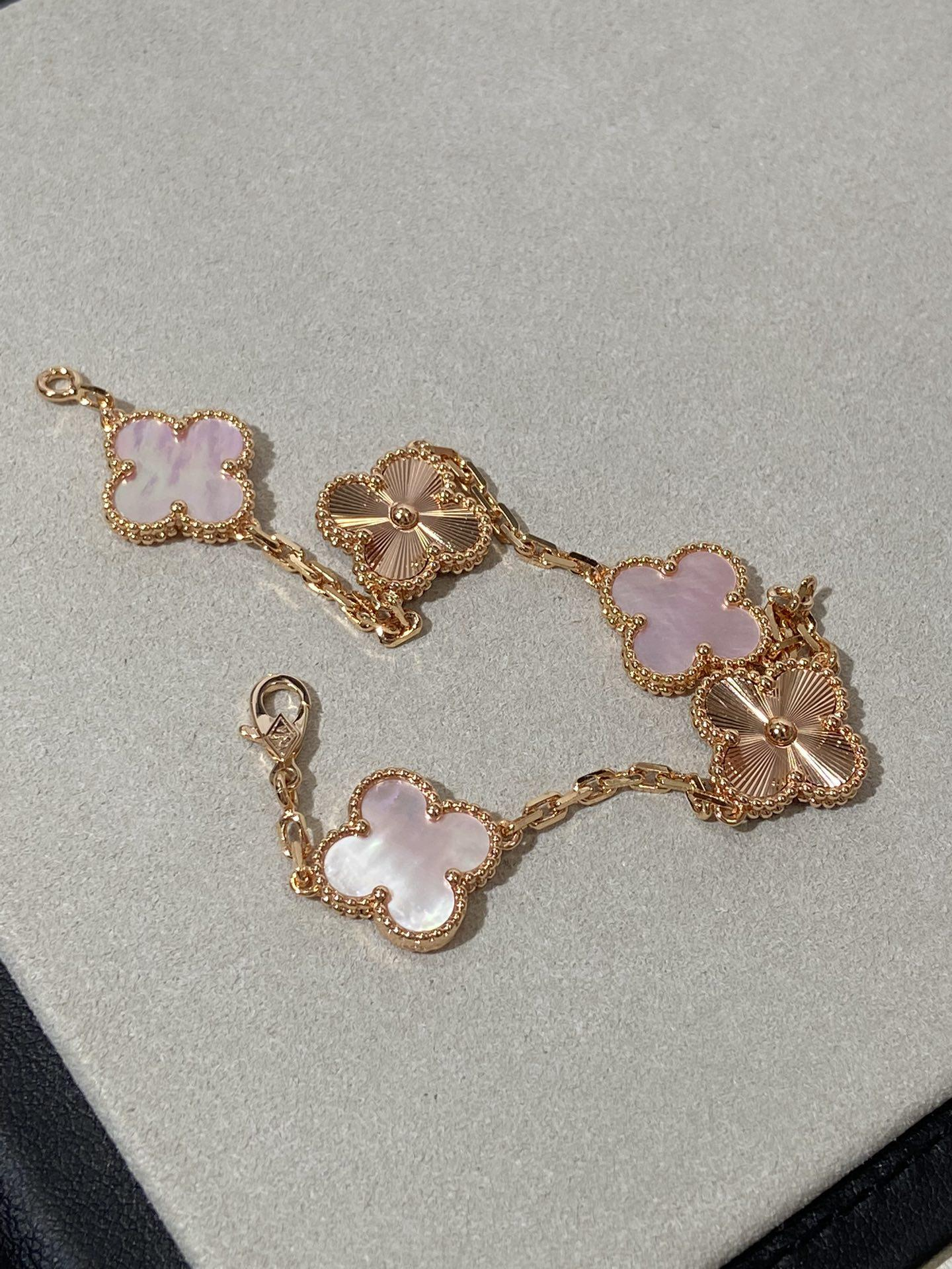 Each motif is crafted with exquisite attention to detail, highlighting the graceful curves and balanced symmetry of the Maison’s iconic four-leaf silhouette. The five motifs are arranged in a fluid, harmonious rhythm, creating a luminous line that rests elegantly along the wrist.
