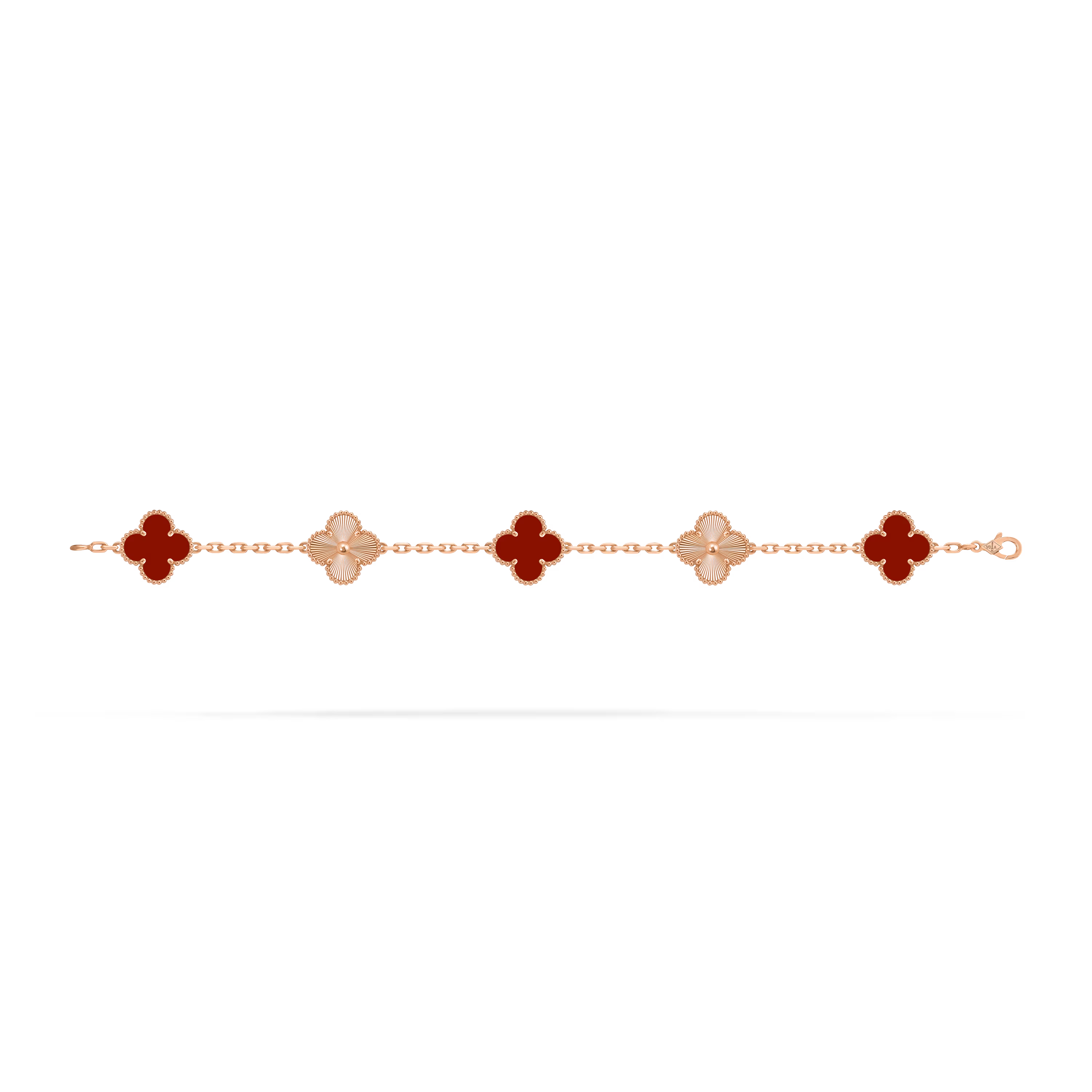 This bracelet features five Vintage Alhambra motifs, evenly aligned along a delicate chain. The symmetrical layout creates a graceful rhythm on the wrist, reflecting classic proportions and balance.