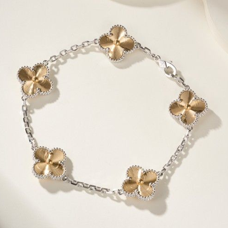 This bracelet features five Vintage Alhambra motifs, evenly spaced along the chain. The symmetrical composition creates a balanced and elegant rhythm on the wrist, highlighting the purity of the original design.