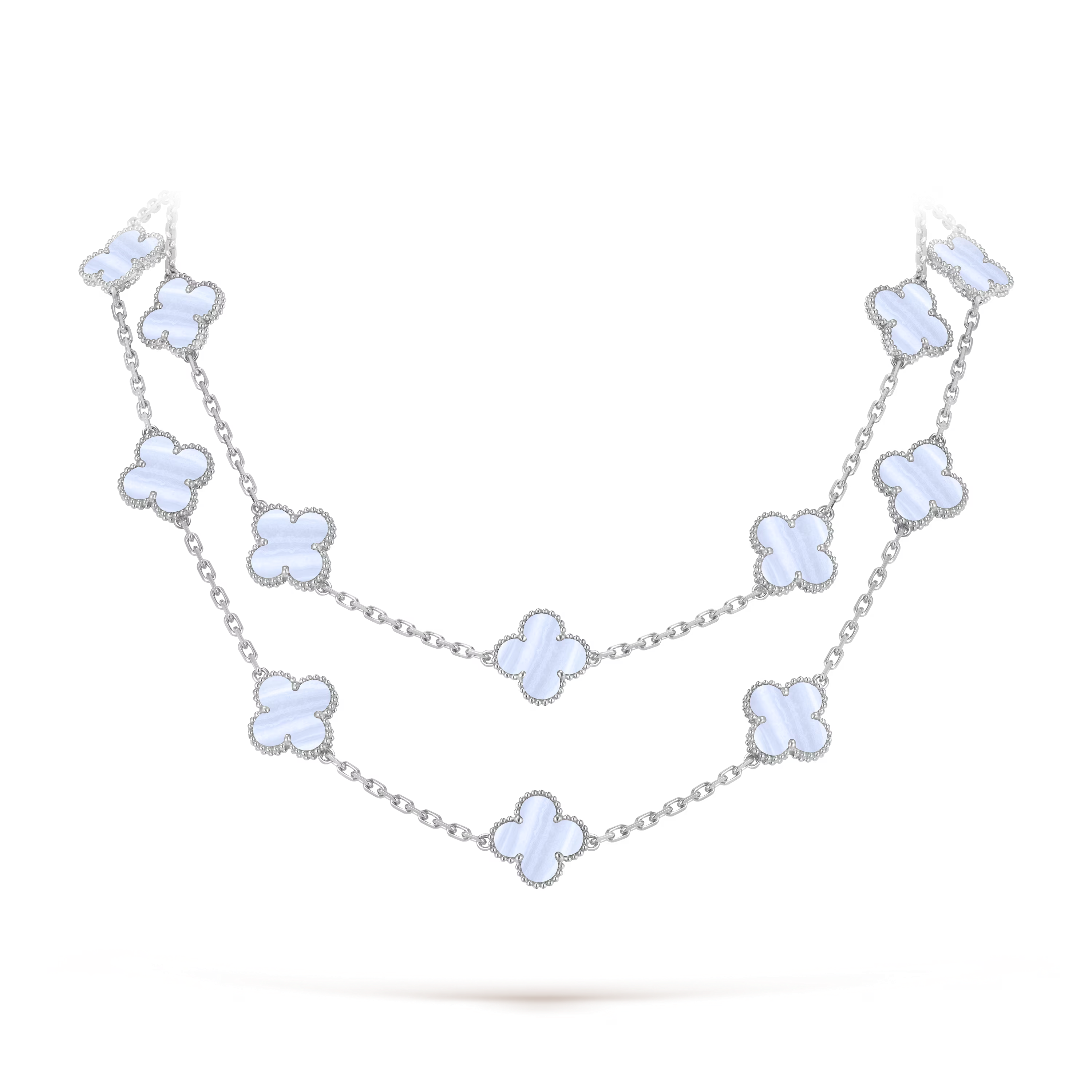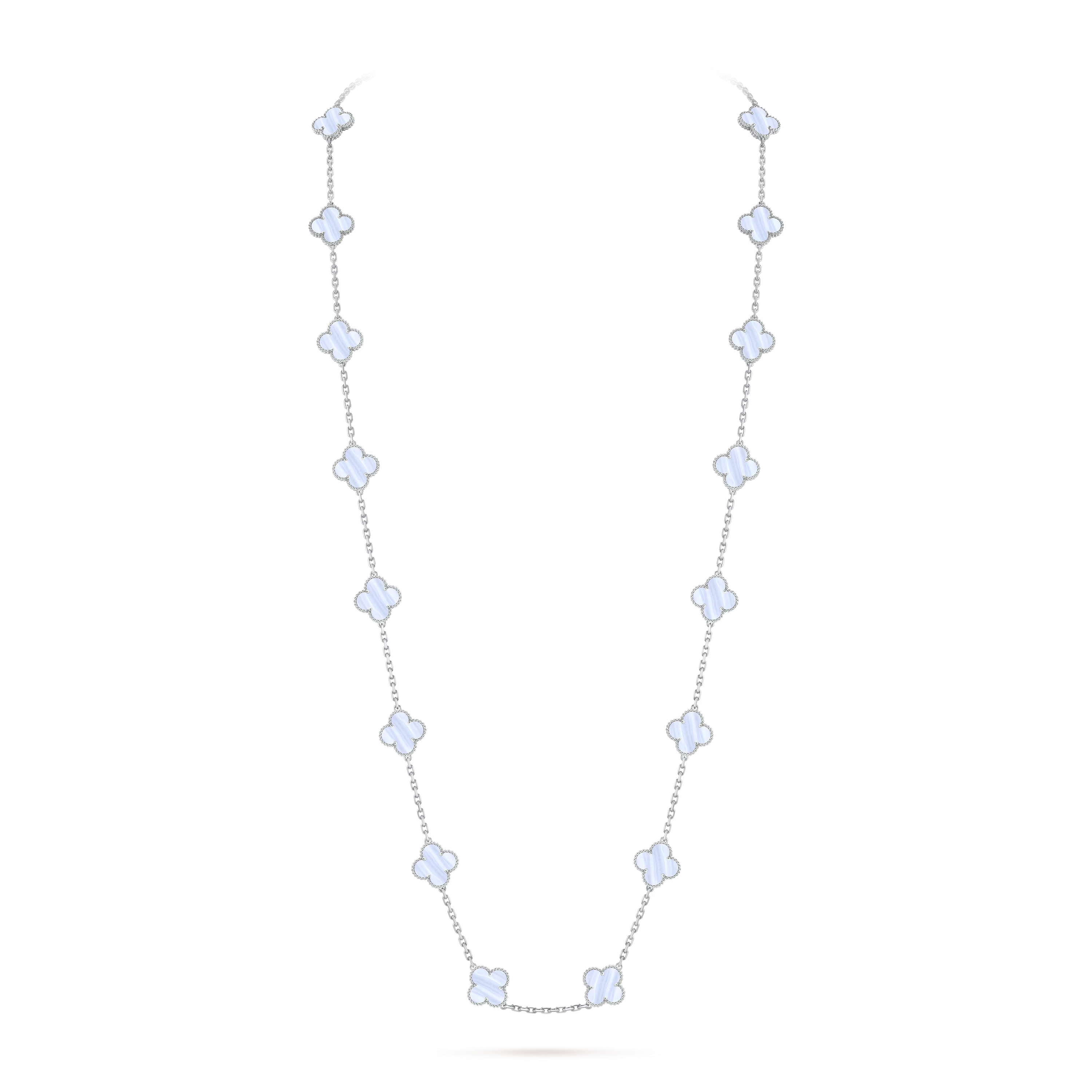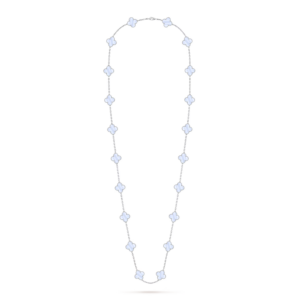 A luminous interpretation of an icon, the Vintage Alhambra Long Necklace in 18K white gold and chalcedony embodies the Maison’s enduring celebration of luck, harmony, and timeless beauty. With twenty radiant motifs arranged in a graceful sautoir length, this creation offers an effortless blend of sophistication and softness.