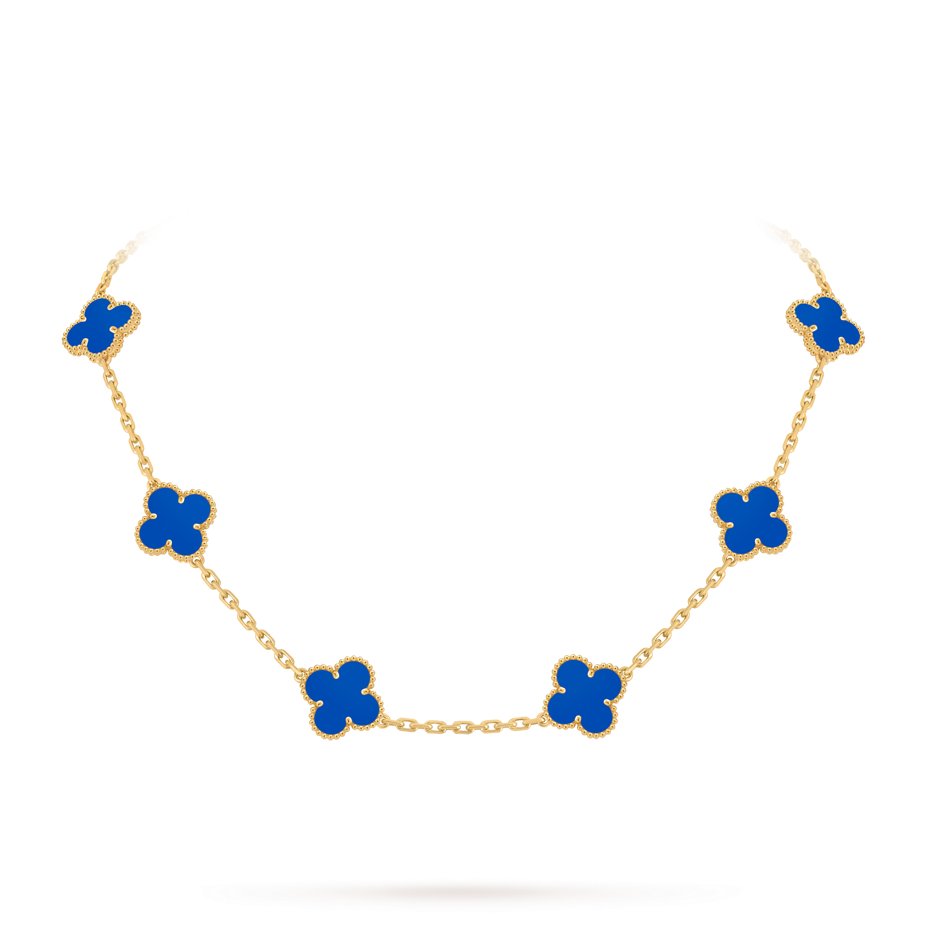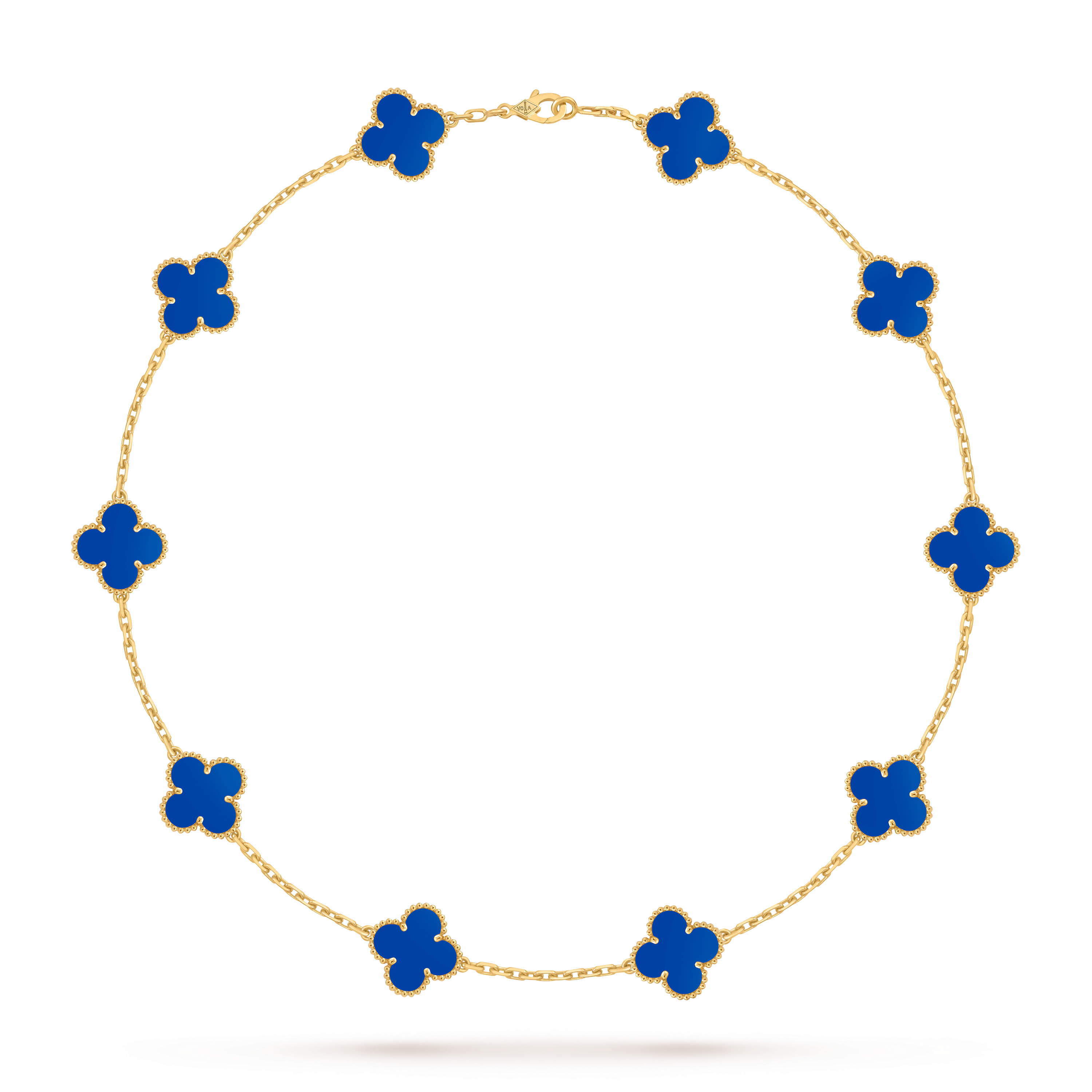 Perfect for everyday wear or special occasions, the ten-motif length rests gracefully along the neckline and pairs beautifully with other Alhambra creations. It is a radiant expression of joy, luck, and the Maison’s poetic artistry.