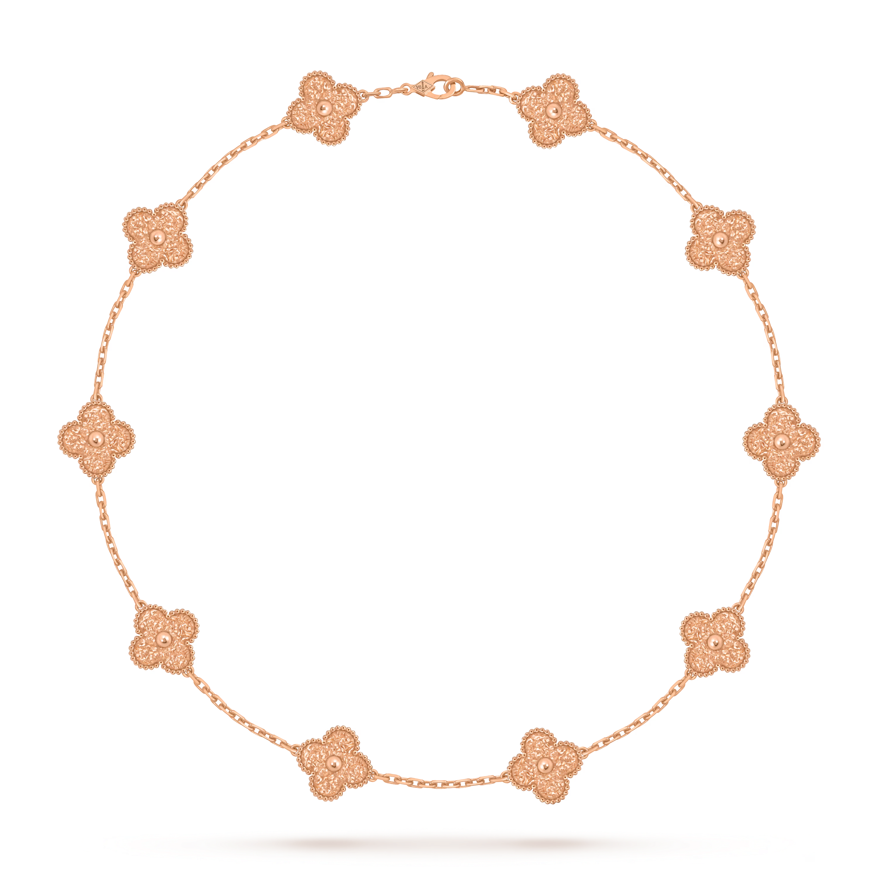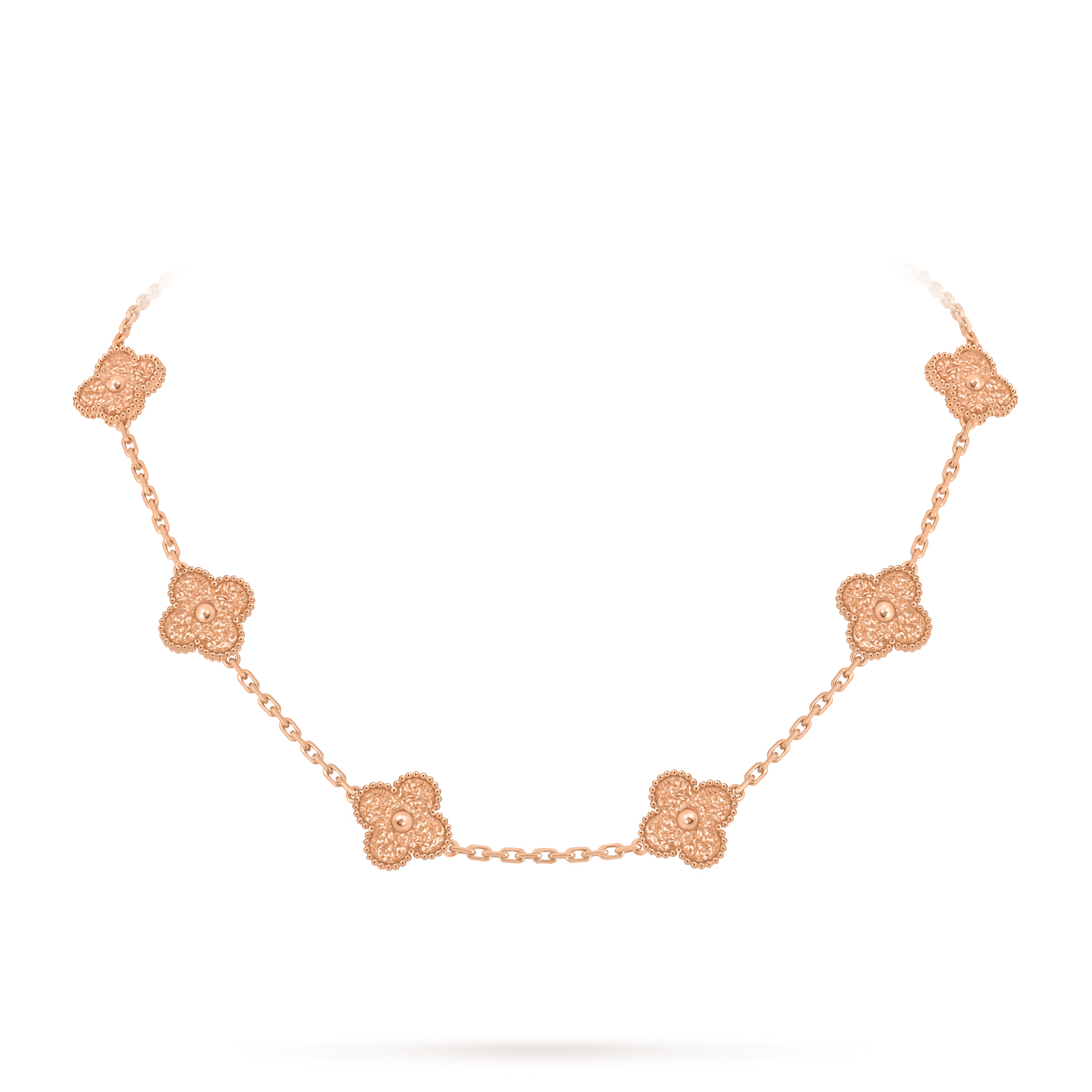 The rich rose-gold hue brings a soft, sun-kissed glow to the iconic motifs, while the signature beaded contour highlights their elegant silhouette and meticulous detailing. The necklace’s balanced length and harmonious design make it versatile for everyday wear or as a sophisticated statement for special occasions.